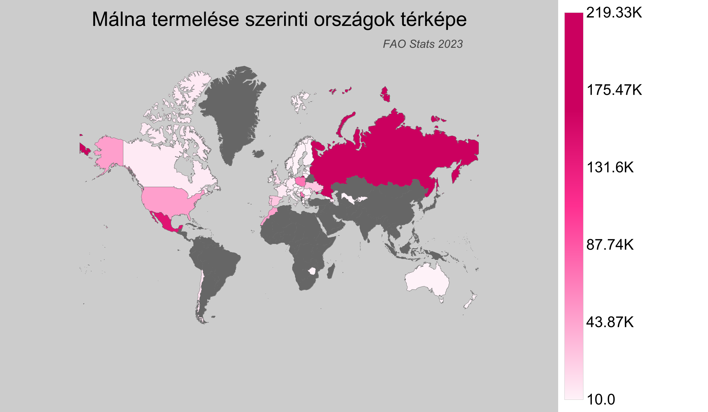 A málna egy rendkívül fontos gyümölcs a világ számos részén, köszönhetően az ízének, tápanyag-tartalmának és egészségre gyakorolt jótékony hatásának. Különösen a hűvös, mérsékelt éghajlatú régiókban kedveltebb növény, ahol jól fejlődik. Az adatokat a 2023-as év FAO statisztikái alapján hoztuk el, melyek a legfrissebbek, elérhetőek 2025-ben.